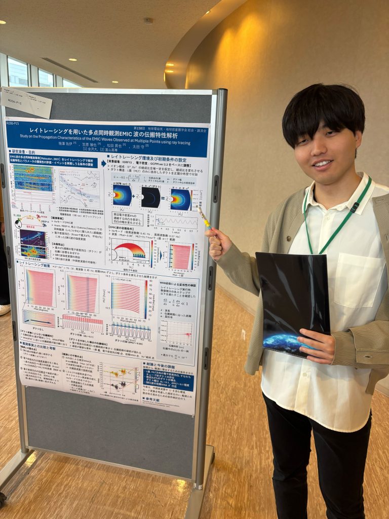 11月24日~27日に神戸で開催された第158回地球電磁気・地球惑星圏学会総会・講演会にて,当研究室の梅澤 祐伊さん(M2),大坪 靖典さん(M2),佐渡 匠さん(M2),慈道 楓真さん(M2),德田 晴哉さん(M2)と,笠原教授が,あらせ衛星の観測データを活用した科学成果に関する講演を行いました.